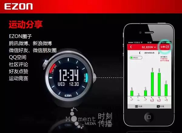 5)运动分享:可分享运动数据到EZON圈子、新浪微博、腾讯微博、微信好友、微信朋友圈。